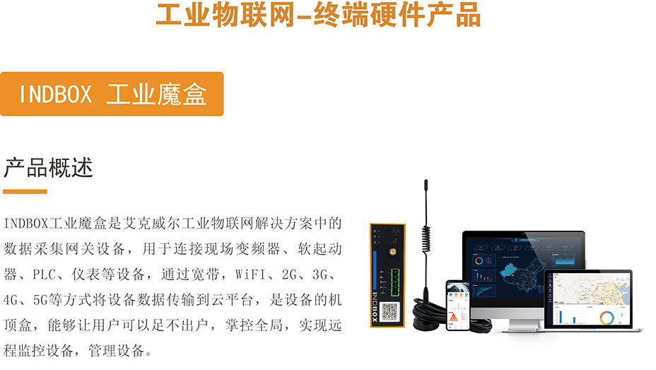 INDBOX工業(yè)魔盒是艾克威爾工業(yè)物聯網解決方案中的數據采集網關設備,用于連接現場變頻器、軟起動器、PLC、儀表等設備,通過寬帶,WiFI、2G、3G、4G、5G等方式將設備數據傳輸到云平臺,是設備的機頂盒,能夠讓用戶可以足不出戶,實現遠程監(jiān)控設備,管理設備。